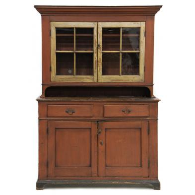 Late 18th century, pine, two-piece form, the upper section with eight light enclosing a shelved interior featuring a plate rail and spoon slots. The lower section has two lipped drawers over two paneled doors, applied black painted bracket foot base.
