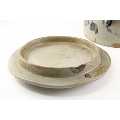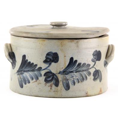 With lid, second half 19th century, decorated all around with floral and leaf design, lid also with some cobalt decoration, Albany slip interior.