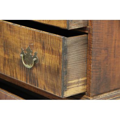 Connecticut or Rhode Island, late 18th century, tiger maple, with chestnut secondary wood, two part form, top with stepped applied cornice above five graduated lipped drawers; the base having applied waist molding over four graduated lipped drawers, raised on original ogee bracket feet. Top case width 36 in.