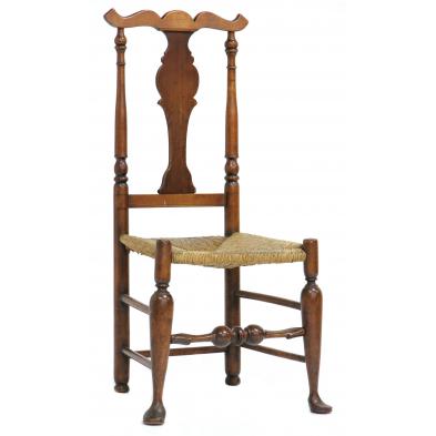 Mid-18th century, maple and pine, attributed to the Dominy Craftsmen of East Hampton, New York with distinctive shaped crest rail and splat, rush seat (replaced) double side stretchers, turned baluster front legs terminating in duck feet.
