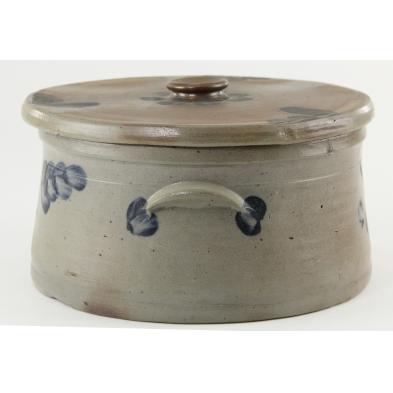 Chip to underside of lid; scattered small firing defects; several small chips to lid edge and crock rim.