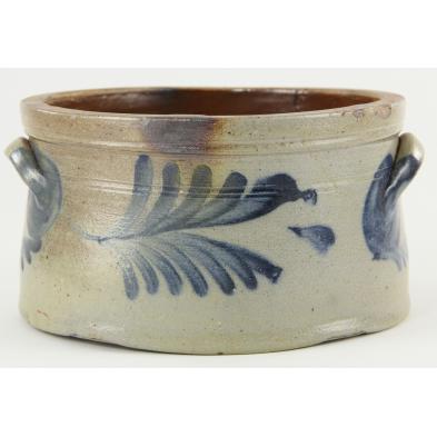 19th century, the first with cobalt stripes, no handles (4.5 x 7 in) (rim chip); the other two (5 x 9 in.) (one with chipping to rim), both with applied lug handles and brushed cobalt leaves.