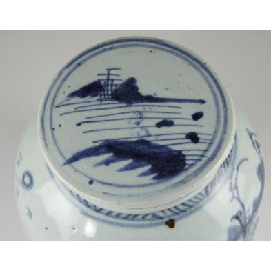 19th century, (2) blue and white with abstract design, the third with blue and white decoration featuring a fisherman (7.25 in.), included in the lot are (2) unrelated ginger jar lids.