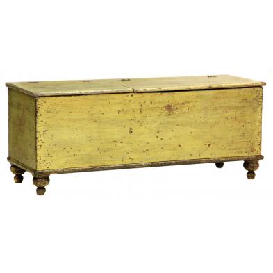 Late 19th century, probably Pennsylvania, dove-tailed case with worn yellow painted surface, top with two hinged lids over two wells for kindling and logs, turned feet.