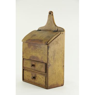 Late 19th century, pine, worn mustard painted surface, dove-tailed with convex hinged lid over storage compartment, two lower drawers.