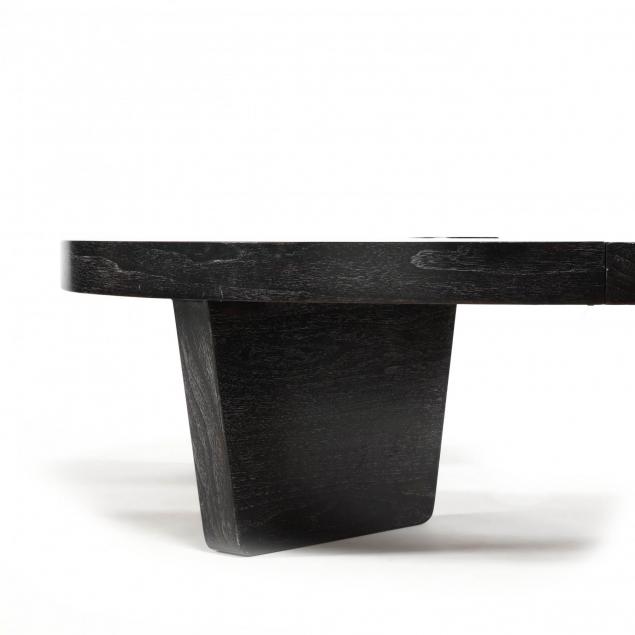 1950s, black stained walnut, two part form configures to a circle or 'S' shape with glass tops, unmarked.