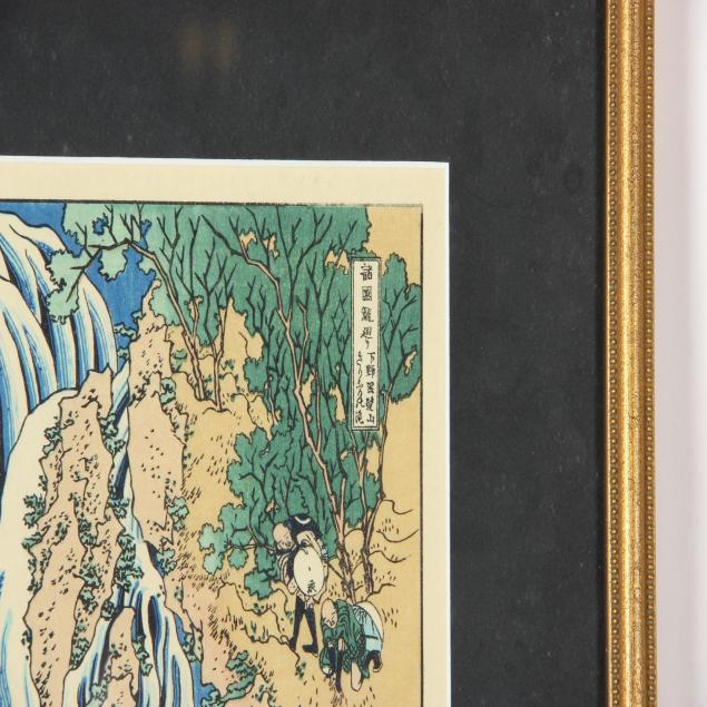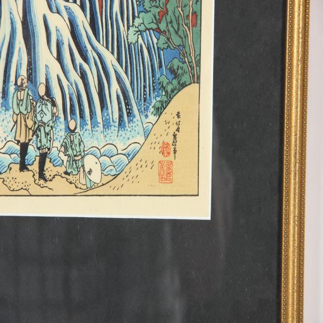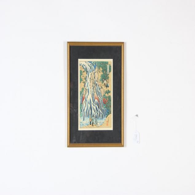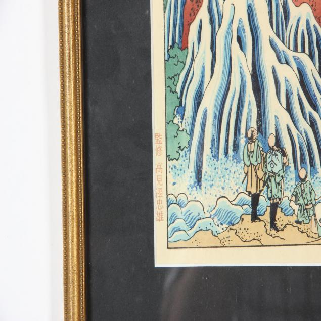 Kirifuri Waterfall at Kurokami Mountain in Shimotsuke from the series "A Tour of Waterfalls in Various Provinces" (17 x 13.75 in.; very good condition), and an original print by Utagawa Kunisada from the 1858 triptych