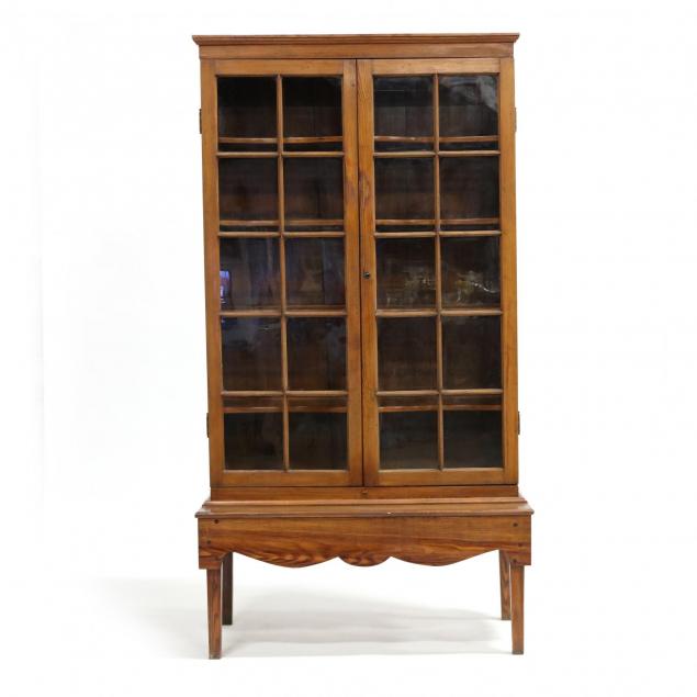 19th century, two part form, yellow pine, dovetailed case with applied molded cornice, two hinged doors having ten panes, interior with four shaped shelves, base with scalloped skirt raised on straight legs.