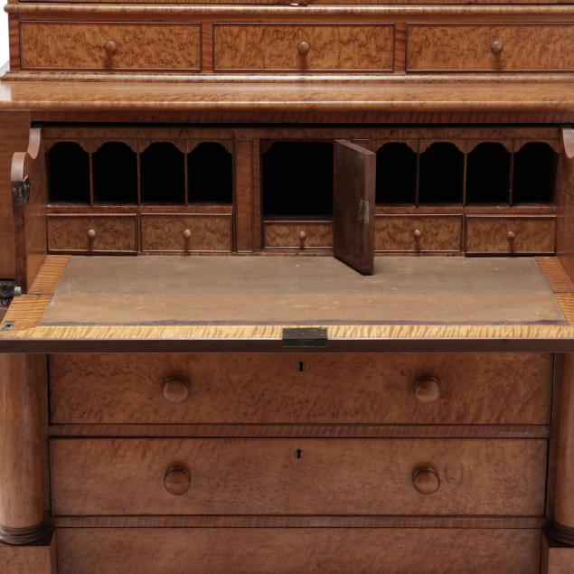 Circa 1830, mid Atlantic region, tiger maple, birds eye maple and mahogany, secondary woods are poplar and white pine, two part form, upper bookcase with flared projecting cornice above two mullioned glazed doors above three side by side drawers, the lower case with a pull out fall front butler's desk featuring a divided interior and central prospect door, above three cock beaded long drawers with solid birds eye maple drawer fronts having a secret lower skirt drawer, flanked by fully turned Corinthian columns, paneled sides raised on bold hairy paw front feet and rear turned feet.