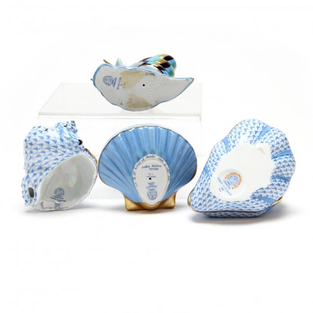 Blue fishnet, two with mother-of-pearl interior, including an oyster open to reveal a large 'pearl' (3.25 x 4 in.)