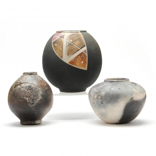 1980s, including a Ray Kaylor (NC) vase, Joel Bennet (CA), and Irish-Hosler decorated vase, signed.