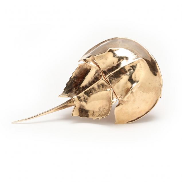 The yellow gold brooch in an articulated horseshoe crab design completed with single pin stem and locking C clasp, stamped 14KT and signed.