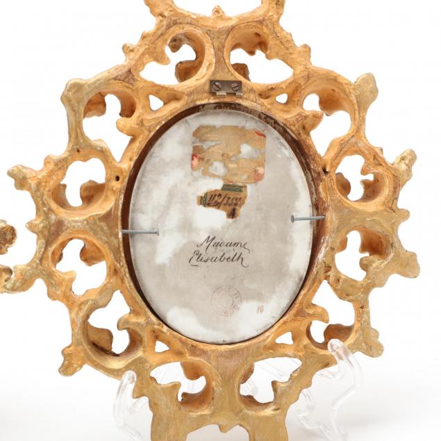 Madame Elisabeth with worn signature and printed marks to verso; the second depicting Queen Louise of Lichtenstein, unsigned, impressed "15" to verso; each presented in a period Venetian style gilt frame and retaining old paper labels to the verso.