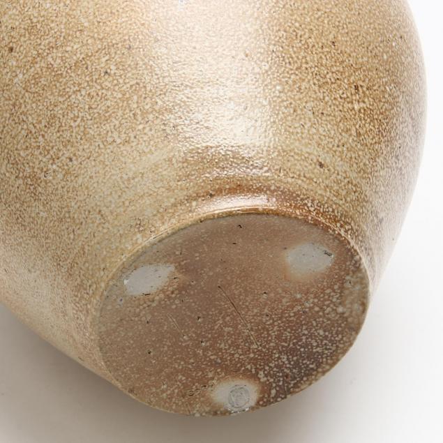 Ovoid form with an ash glaze highlighted by blue glass runs over incised diamond shapes, impressed glyph on the bottom.