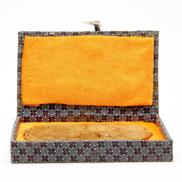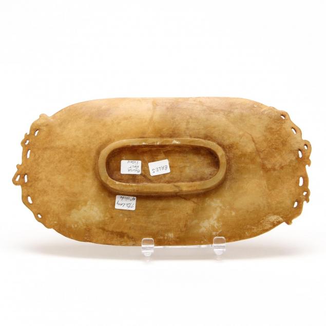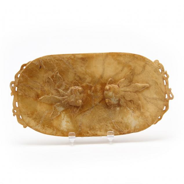 A Chinese hard stone brush rest tray with two goldfish, comes with decorative box.