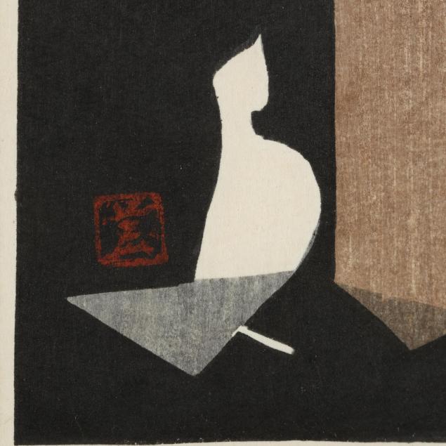 Woodblock print, ink and colors on paper, depicting a girl with her hands together and eyes downcast to the doves at her feet, self-published by the artist, with the artist's red seal in lower left corner, professionally framed with mat under glass, not examined outside of frame.