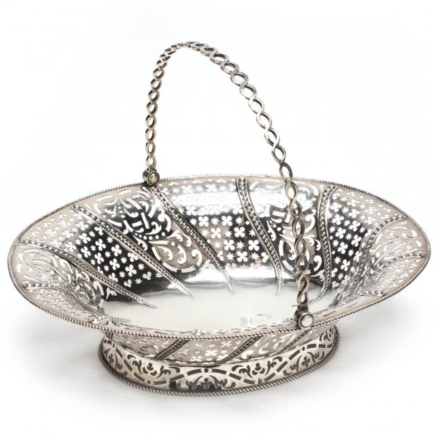 Sponsor's mark for Aldridge, London (1765) hallmarks, oval form with elaborate pierced decoration, open twist swing handle, raised on conforming pierced foot.