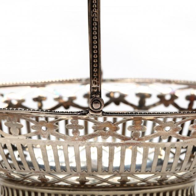 Sponsor's mark for Bateman, London (1787) hallmarks, pierced oval form, raised on pierced conforming foot, with swing handle.