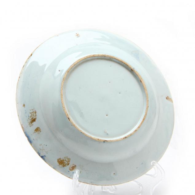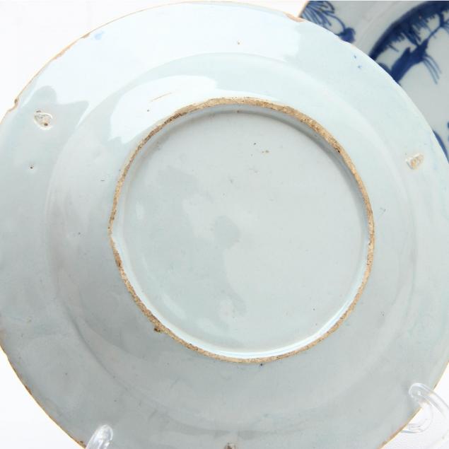 18th century, including a pair of tin glazed plates with man and rooster, one Canton dish and one small English transfer plate.
