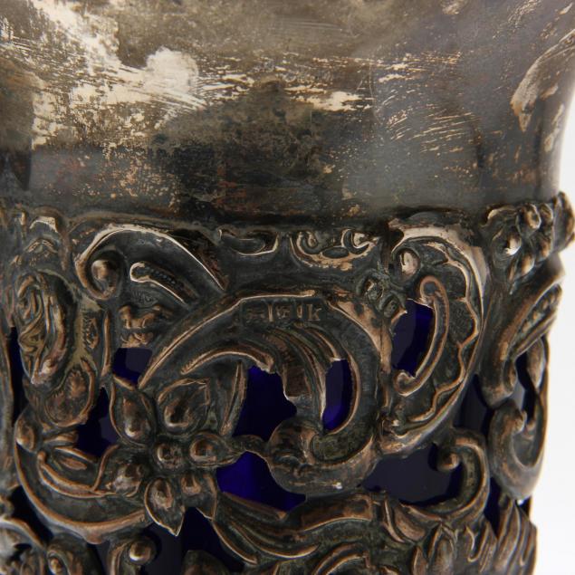 London (1905) hallmarks and "WC" sponsor's mark, ornate cutwork and floral repousse in the Rococo style with cobalt glass liner, presentation engraving to cartouche reads "Au Professeurs / Dr. L. Demelin / Souvenir reconnaissant / Paris / 9-6-07."