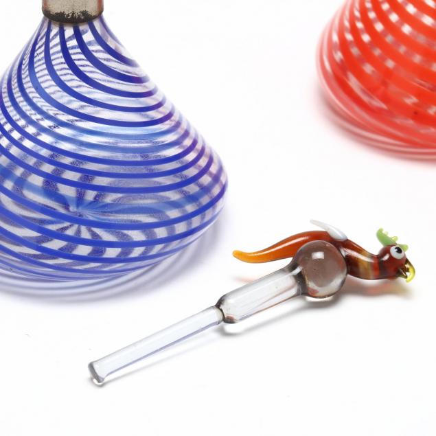 Mid 20th century, hand blown red and blue swirl bottles with flame worked finials featuring elephants and a parrot, unmarked.