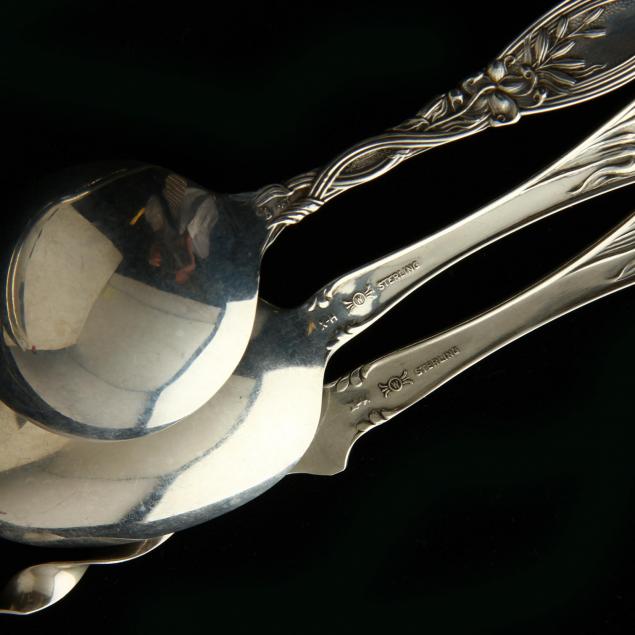 Including a Frank Whiting "Lily - Floral" sardine fork (7 3/8 in.), butter pick, and (6) teaspoons; (4) International "Frontenac" bouillon spoons (5 in.) and (2) strawberry forks; (6) Wallace "Violet" bouillon spoons (5 1/8 in.); and (4) floral strawberry forks, att. Reed & Barton (4 1/8 in.). No monograms.