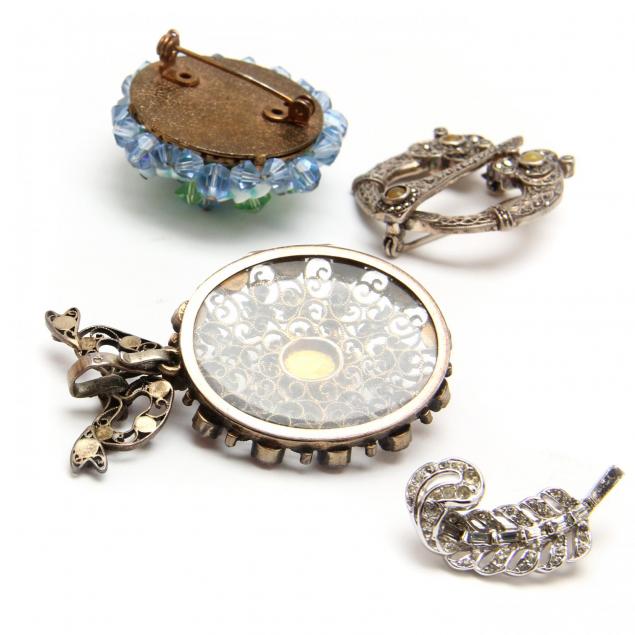 The Estate of Ms. Frances Jefferson Bowman, Wytheville, VA Rhinestone ribbon brooch missing two stones; one Coalport brooch with petal chip.