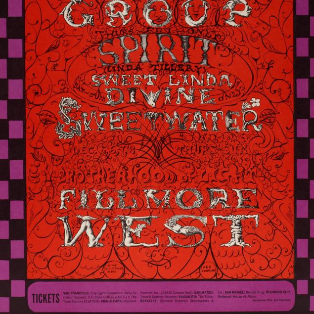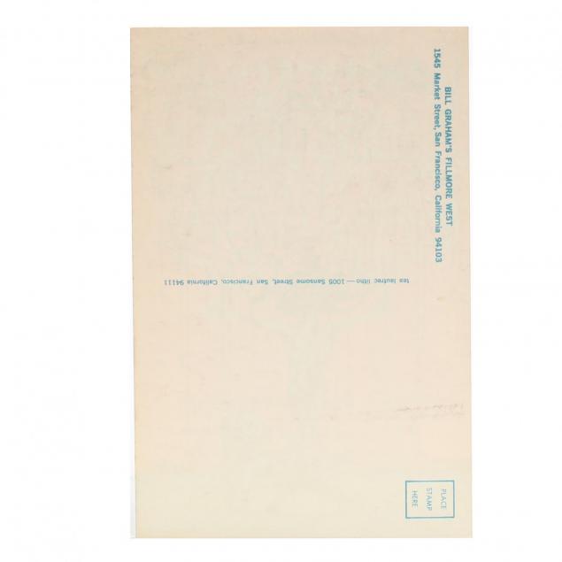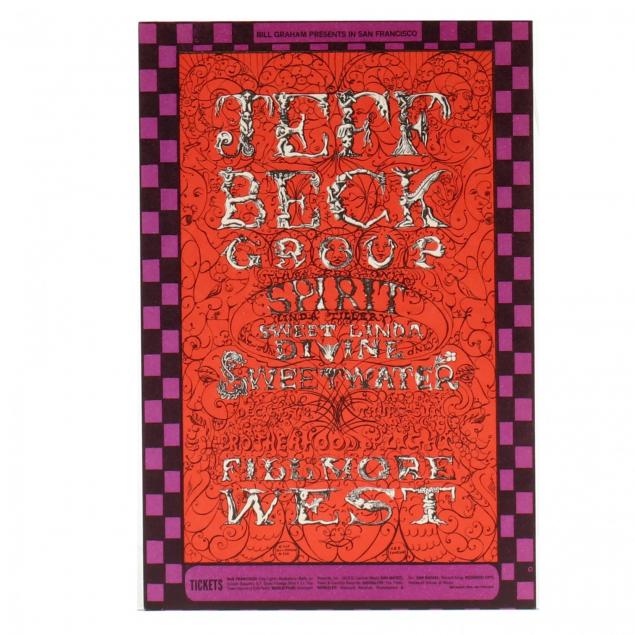 All original first printings, designed by Lee Conklin, posters to include Jeff Beck Group at Fillmore West (BG-148) and Ten Years After at Fillmore West (BG-145), each with corresponding Type A postcard bearing "place stamp here to verso," also included is single BG-145 ticket, unframed. (5 total items)
