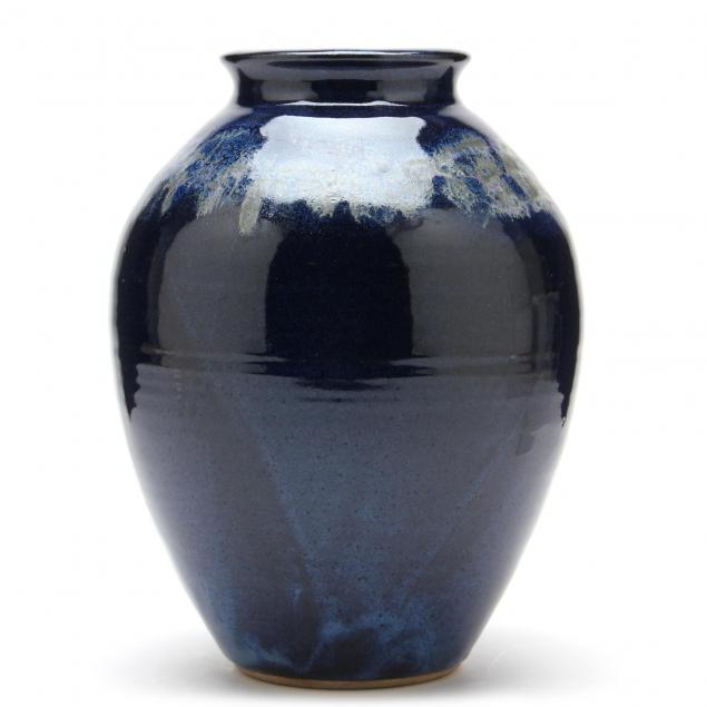 Early 2000s, Dirt Works Pottery, Seagrove, cobalt glazed stoneware with luster highlights at the upper shoulder, marker signed on the bottom.