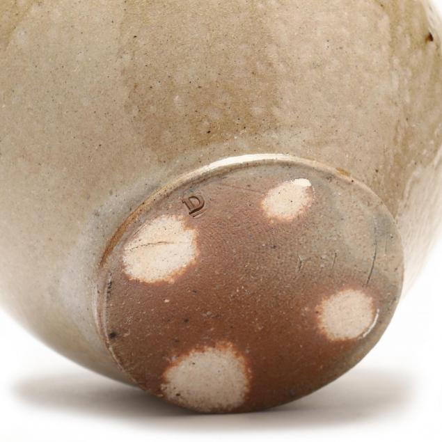 High gloss ash glaze, applied loop handles at the neck, stamped "D" on the bottom for Daniel Johnston.