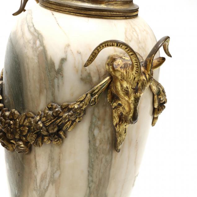 19th century, gilt bronze and marble, lidded form, with pineapple finial, featuring ram's head masks and floral swags, on stepped base.