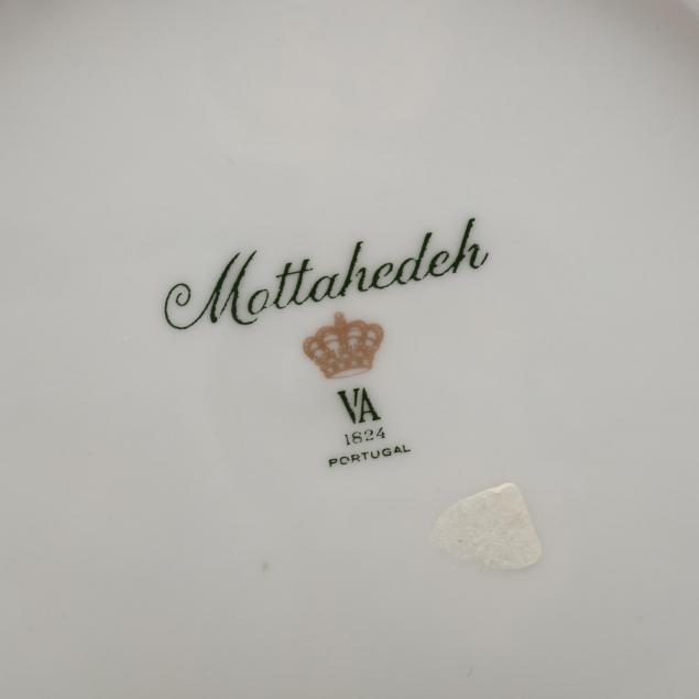 Late 20th century, gently scalloped salmon rims centered with transfer decorated images, marked.