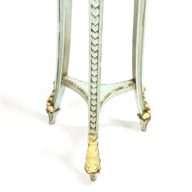 Early 20th century, carved and painted wood with gilt highlights, on stretcher base.
