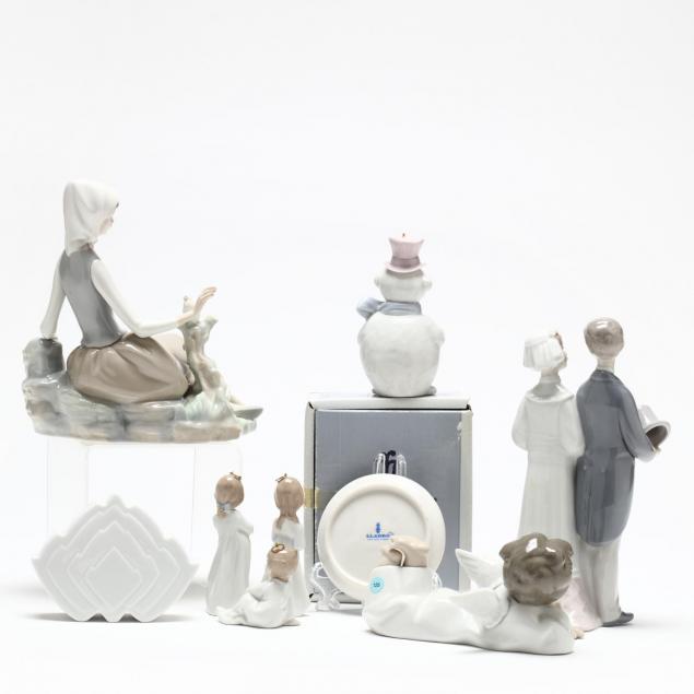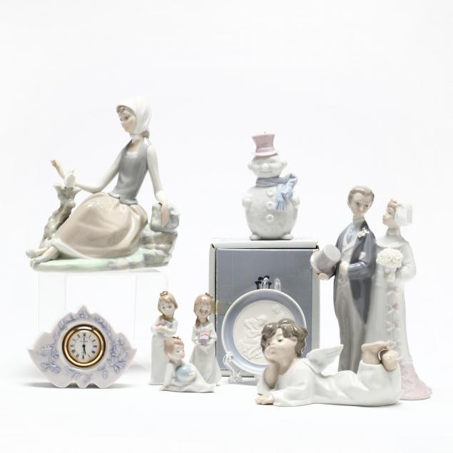 To include four ornaments, a clock, a small plate, an angel figurine, a bridal couple #4808 (7.75 in.) and a seated shepherdess with dove #4660.