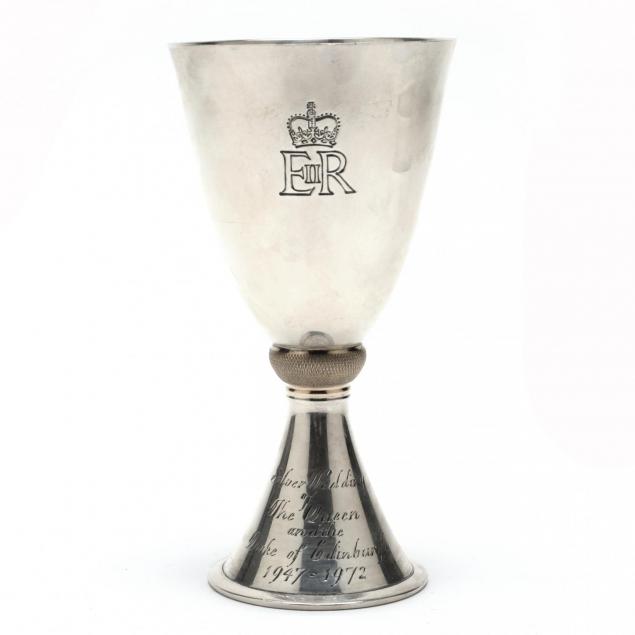 Parcel gilt, London (1972) hallmarks, sponsor's mark of Mappin & Webb, the recto with the Royal Cypher of Queen Elizabeth II and the verso with the Royal Cypher of Prince Philip, hand-engraved "Silver Wedding of The Queen and the Duke of Edinburgh, 1947-1972," numbered 895 from a limited edition of 1000.