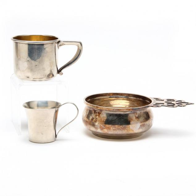 The porringer by S. Kirk & Son, a parcel gilt cup by Gorham (2.25 in.) (with denting), and a small cup by Stieff. No monograms.