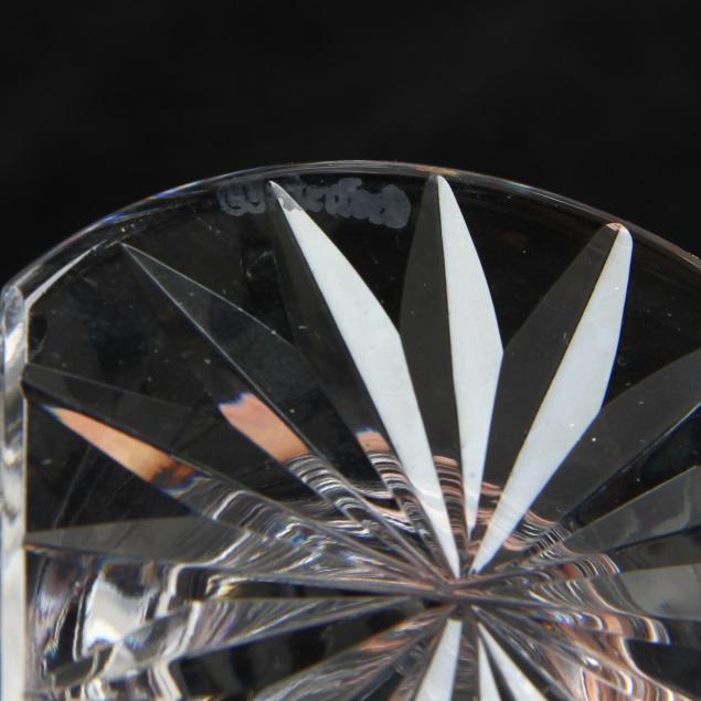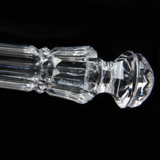 To include a cut crystal handled knife and pie server set, signed Waterford; a knife rest, signed Waterford, and a crystal serving tray, appears to unsigned.
