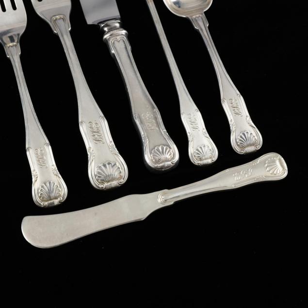 (75) pieces, service for eight, including: (8) knives (8 7/8 in.), (8) forks (7.25 in.), (9) salad forks, (9) seafood / cocktail forks, (9) teaspoons, (6) iced tea spoons, (12) demitasse spoons, (8) butter spreaders, master butter knife, sugar shell, large berry / casserole spoon, almond spoon, gravy ladle, and cream ladle. Period script monogram "EBJ."