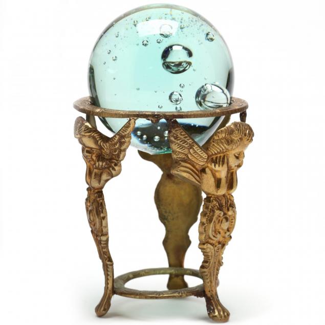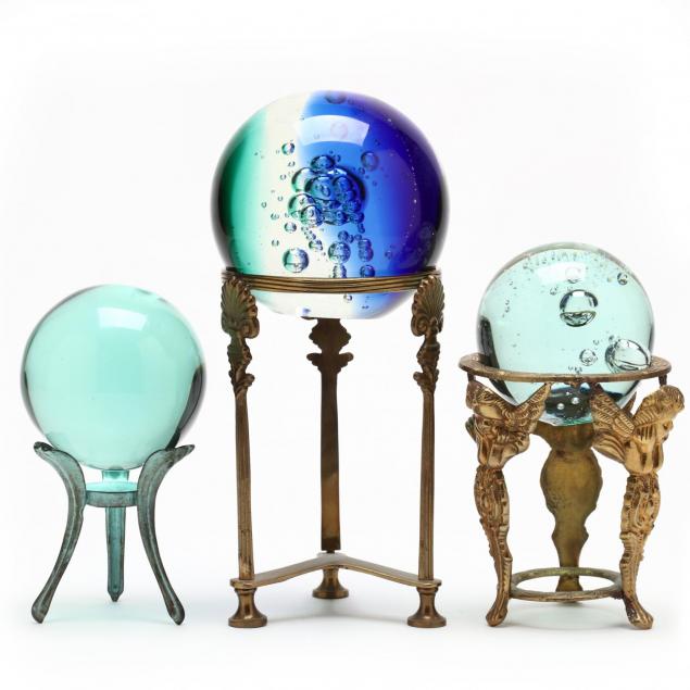 Including two blown balls with encapsulated bubbles both are also cut flat on bottom as to stand alone; largest one with color variation from aqua to clear to cobalt.