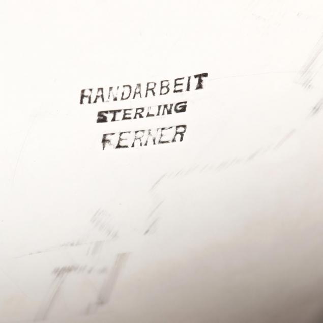The five piece service including a double handled tray, coffee pot (9.5 in.), teapot, sugar bowl with cover, and creamer. No monograms, each piece marked "Handarbeit / Sterling / Fernier."