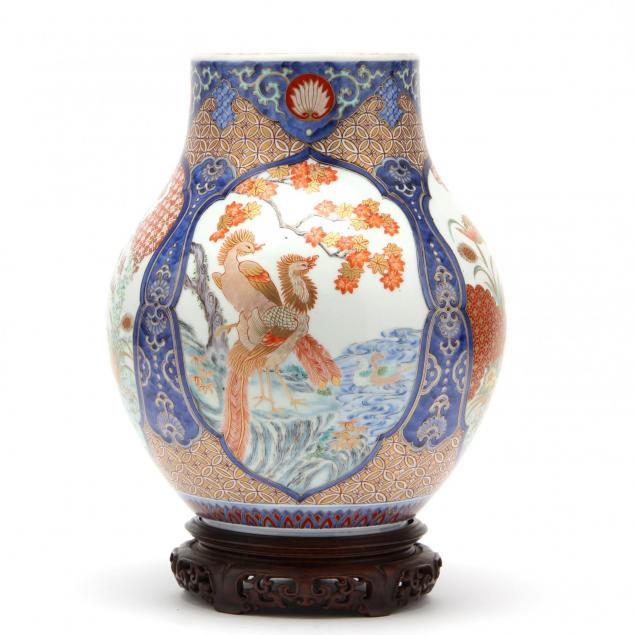 Late 19th century, produced in Arita, in Imari style, marked on the underside with the characteristic red orchid mark of Fukagawa, with a straight rim above a baluster body, four medallions of decoration on the body alternate with a pair of phoenixes and geese in a red-gilt and blue-gilt, comes with carved wooden stand.