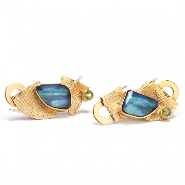 The freeform textured yellow gold plates with one bezel set Boulder opal and with one bezel set round cut and faceted peridot (4.00mm) set to base and with small platinum wire accents, completed with posts and push back findings, signed Jewelsmith and marked 18KT / Plat.