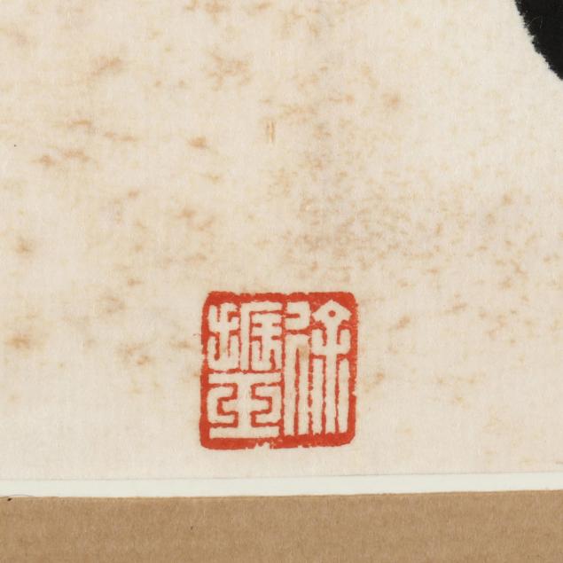 Ink on paper, character is "raku" in Japanese or "le" in Chinese, depicted in black ink, with red seal on lower left hand corner, framed under glass.