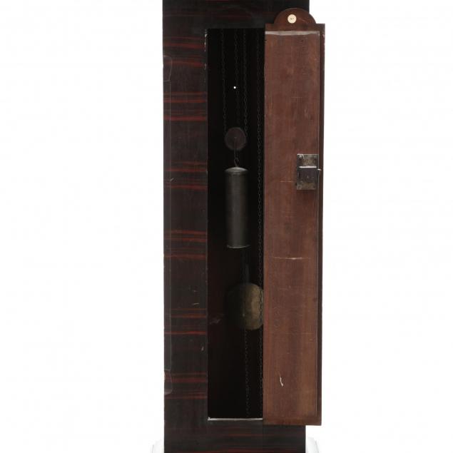 Mid-19th century, Piedmont region, featuring a hood with a stylized swan's pediment above a painted metal face with a date dial, faux mahogany paint decoration over poplar, tombstone waist door, case at waist has chamfered corners with lamb's tongue, straight feet with scalloped skirt. With one weight and pendulum.