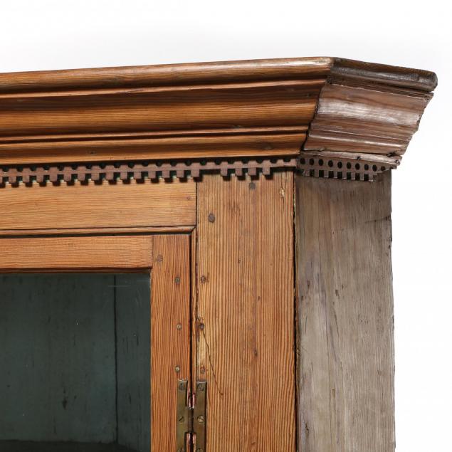 Circa 1790-1800, Perquimans County provenance, yellow pine, one piece form, having a stepped cove molded cornice above applied dentil molding, over two flush hinged doors, each with eight lights which enclose an interior featuring butterfly shelves (later paint), over applied waist and dentil molding; raised panel lower cabinet doors, original bracket front feet. The flat board canted back retains original nails with the rear foot an extension of the full length canted board. Of note is the stylistically unique treatment of the classical dentil molding.