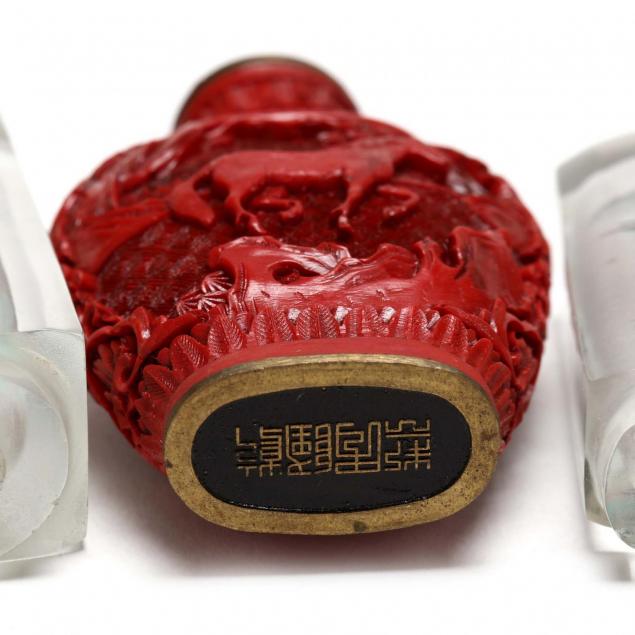 Mid to late 20th century, including one resin cinnabar style bottle, and two inside painted glass bottles.