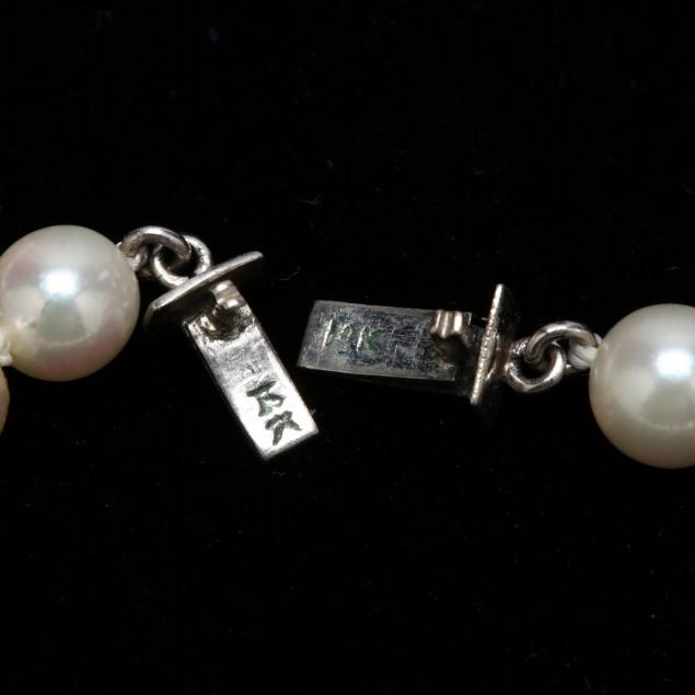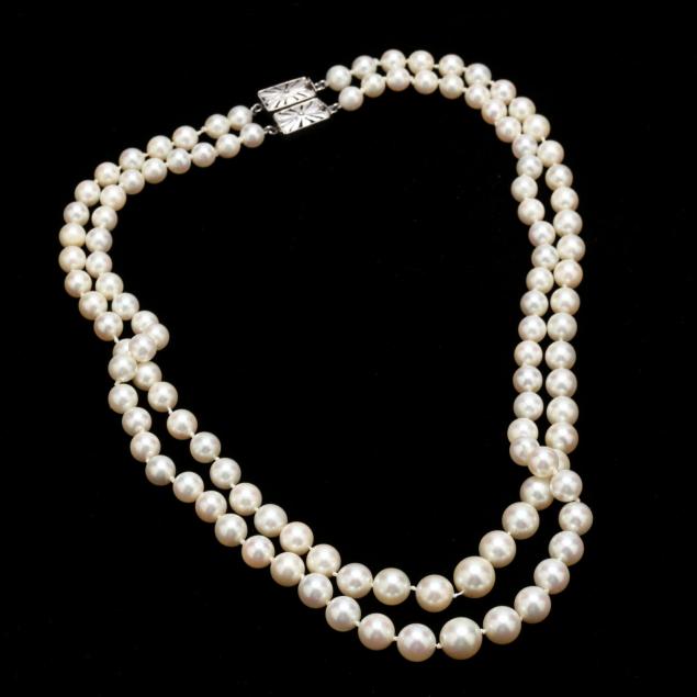 The two strands comprised of (111) graduated white round to near round Akoya pearls measuring 5.50mm - 8.75mm and each completed with a 14KT white gold clasp which can be connected to wear necklace as a double strand. Pearls with good luster, lightly blemished, and well matched.