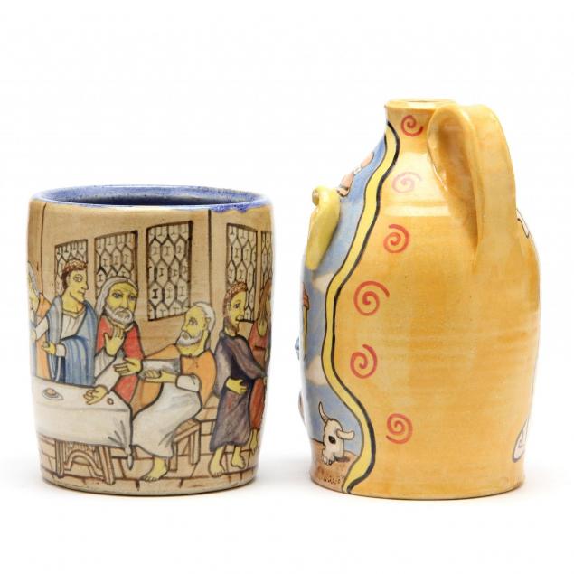 Two decorated pieces: the first is a jug with an askew face and poem on the verso (7.25 in.) and the second is a large drinking vessel depicting the last supper (5.5 x 4.5 in.) Both are signed in marker on the bottom, the jug dated 2007 and the drinking vessel is dated 2004.