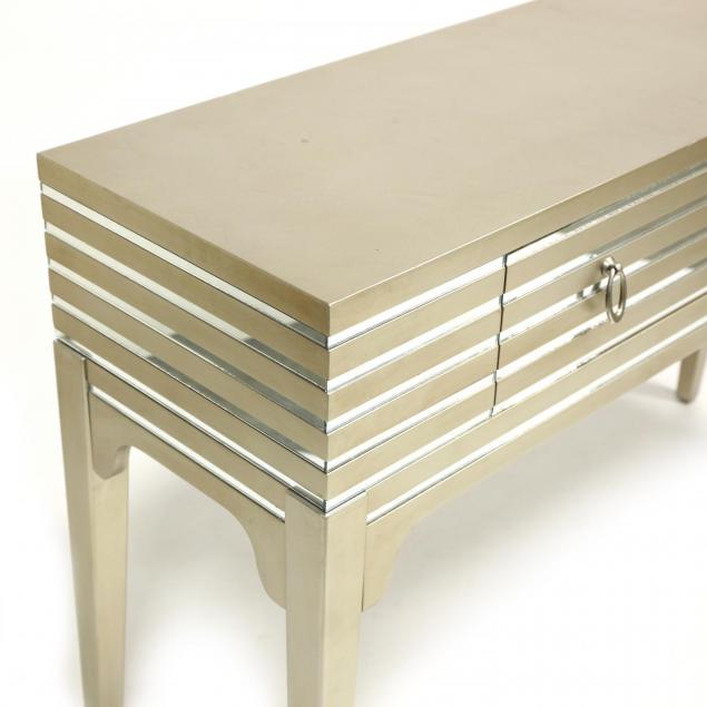 Contemporary, silvered wood, single drawer with mirrored linear design, on square tapered legs, labeled.