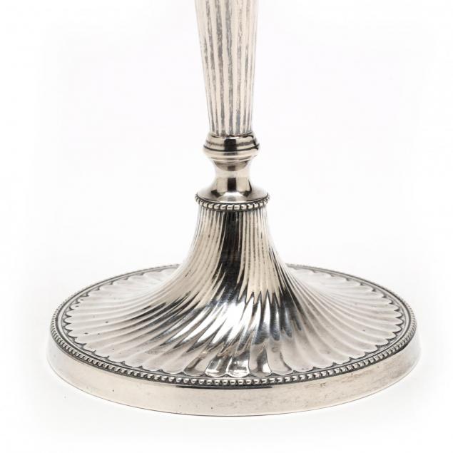 October 17, 1953, convertible form - the three light scrolled arm candelabras may be removed for use as tall candlesticks, finely detailed with swirled flutes to shaft and foot.